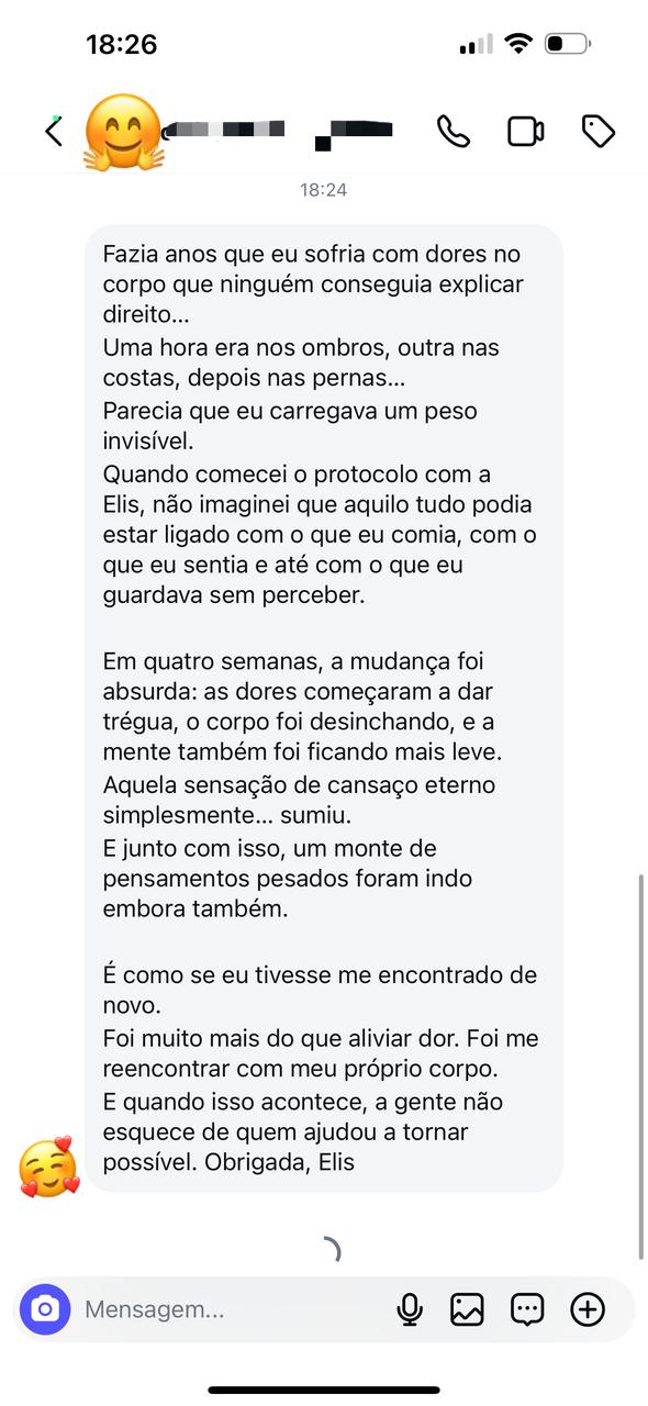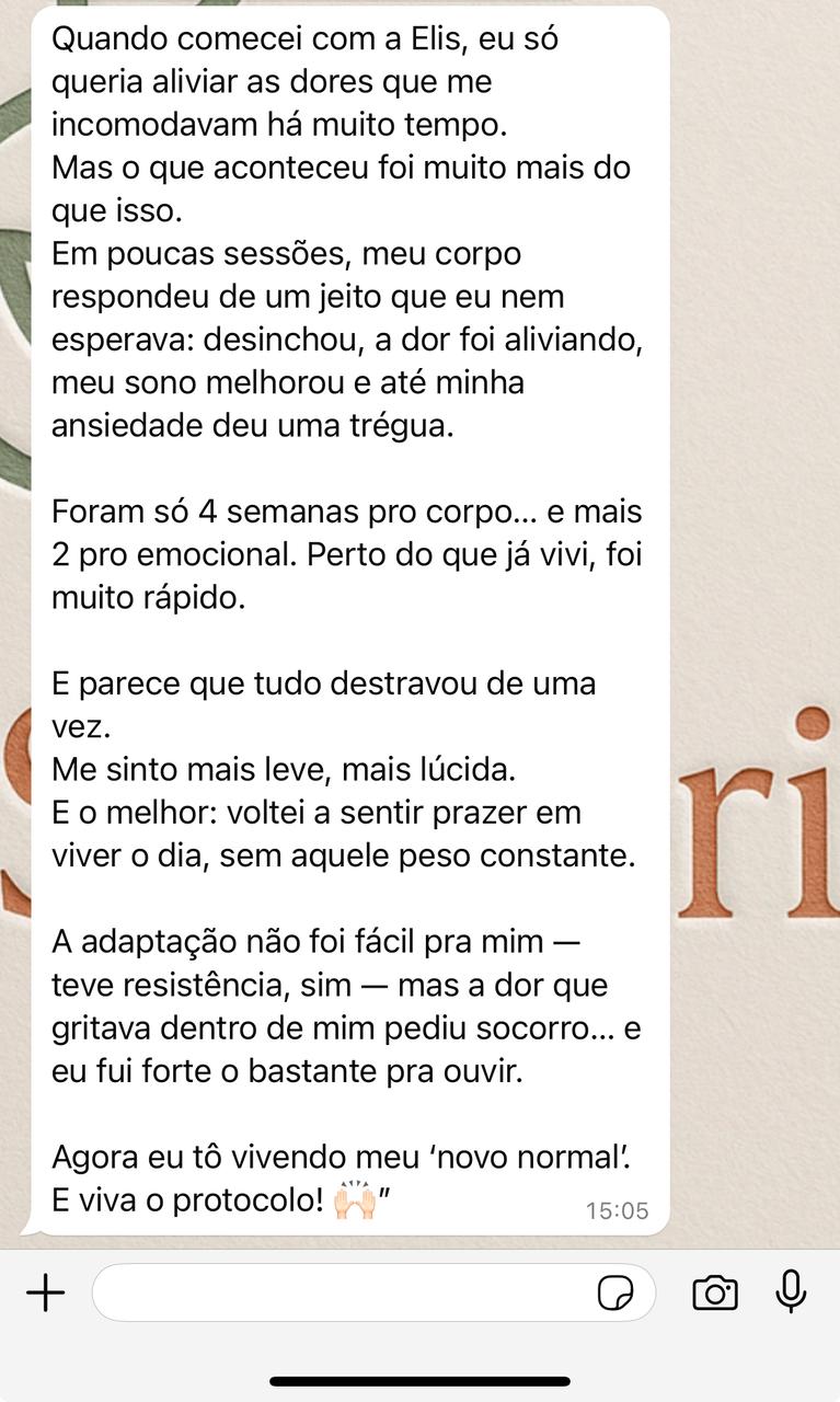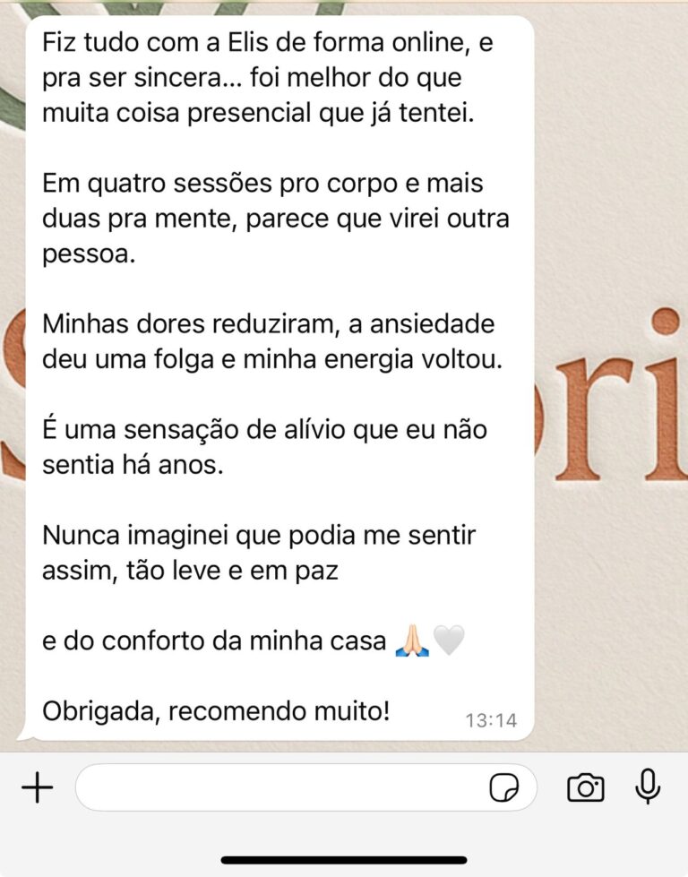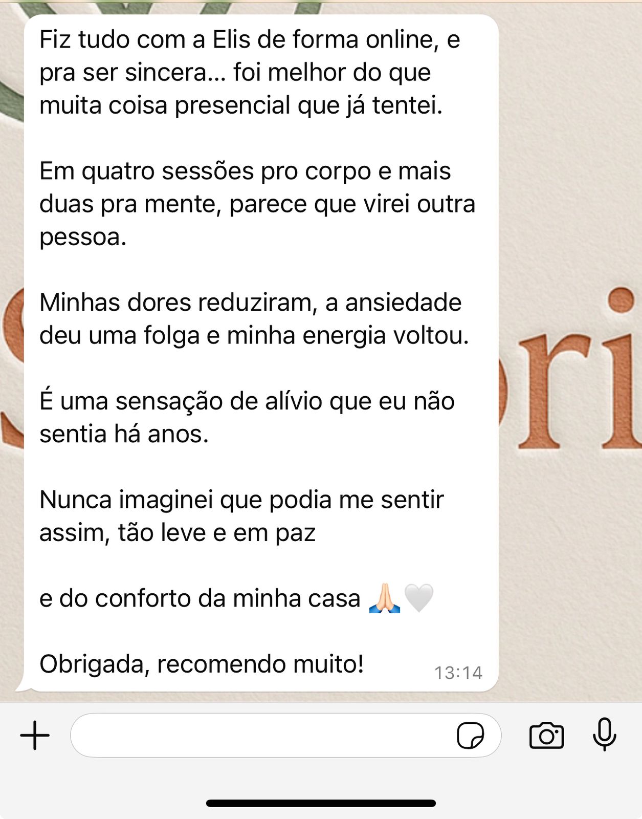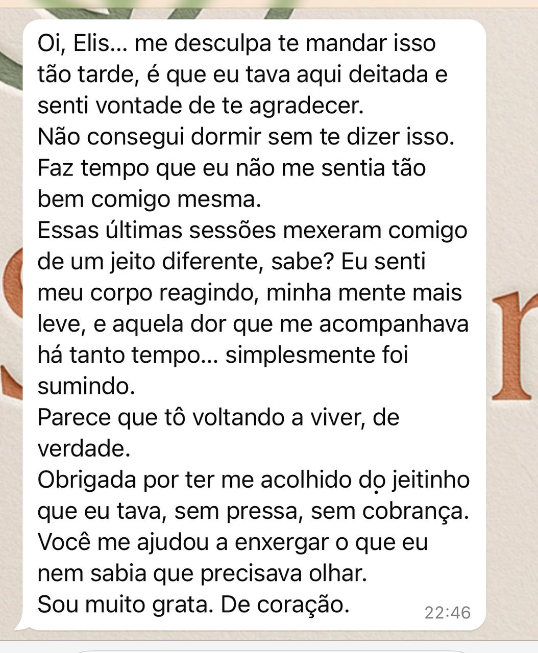 Mais do que aliviar sintomas, meu propósito é te ajudar a acessar o que está por trás da dor — e criar espaço pra mais leveza, presença e liberdade no seu dia a dia.